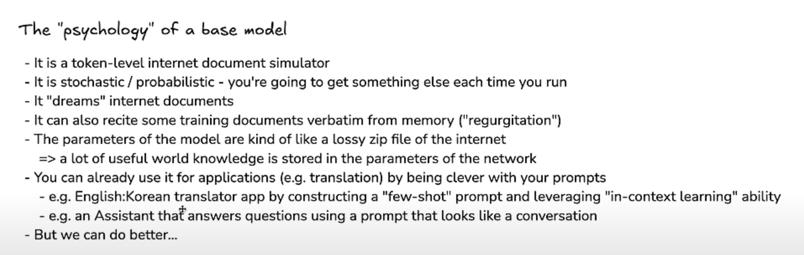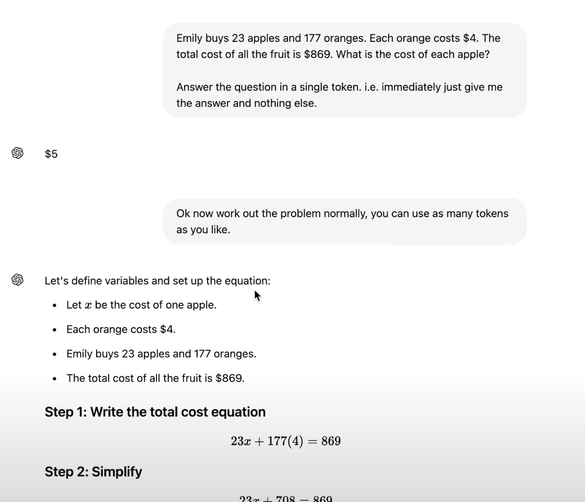 - Karpathy gives an example with ChatGPT-4o where it gives the wrong result to a fairly simple math question if told just to answer immediately, but the correct answer if given time to work it out: