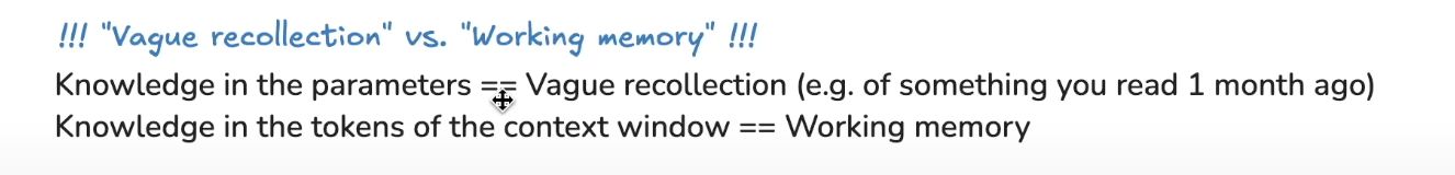 - “Learning facts” comes from pre-training. It’s like compressing the whole internet into a fuzzy/lossy file.