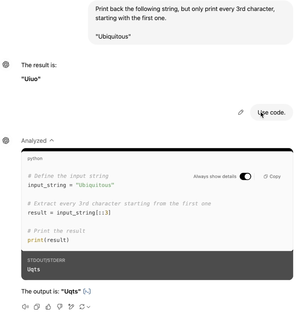 - but actually, models are not good at calculations, it is better if they use tools (e.g. “use code”)