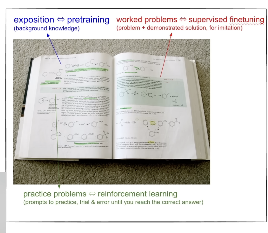 - Reinforcement Learning (RL) — the latest and most exciting stage. Can be done iteratively and continuously. Uses questions and answers, with correct answers reinforced. Potentially can create LLMs that can have completely different thinking strategies to humans. Could surpass human understanding — which happened with AlphaGo (which used RL) and Move 37 in 2016. But can it work with stuff where you can’t easily rank fitness? e.g. write a joke/poem.
