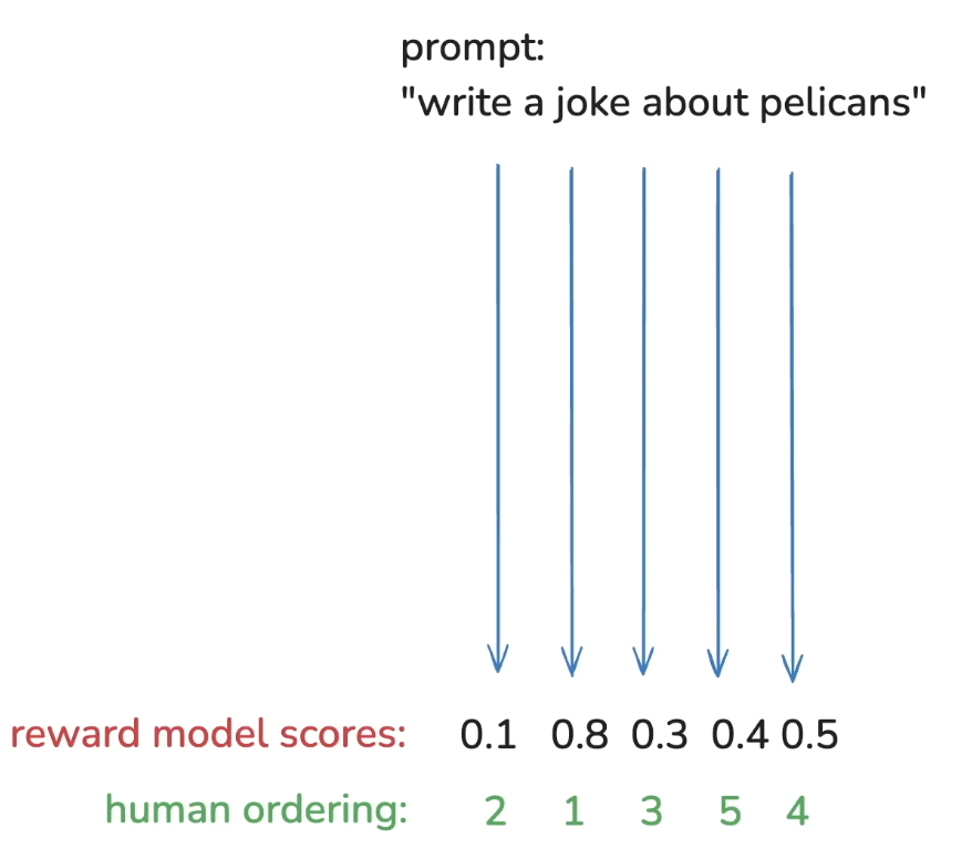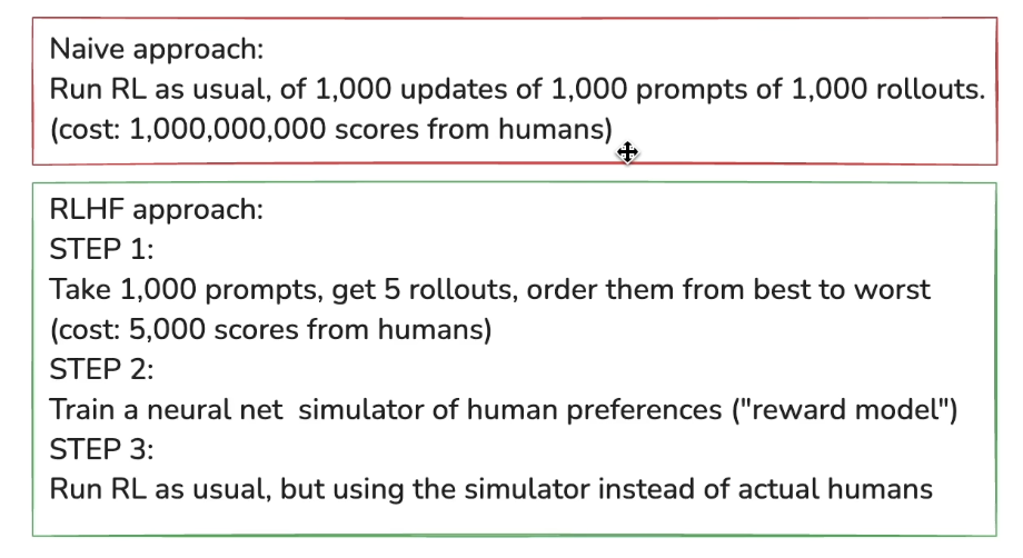 - Reinforcement Learning from Human Feedback (RLHF) — A way to rank fitness for jokes/poem type responses. Real humans put responses in order (e.g. one to five) and a completely separate reward model is trained on that data. Then you use the reward model for further training of the main model. Works but only to an extent because the LLM can find ways to game the reward model, and it’s not possible to fix that because it’s impossible to make a reward model that can’t be gamed.